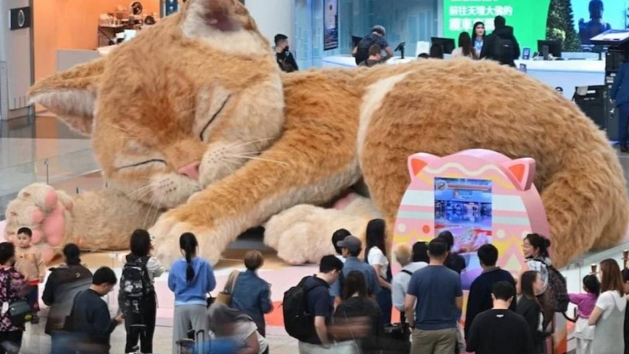 Um gato de grandes proporções tem chamado a atenção de passageiros no Aeroporto Internacional de Hong Kong. A instalação, montada no saguão do Terminal 1 desde o início de abril, se tornou um dos pontos mais curiosos para quem chega ao local.