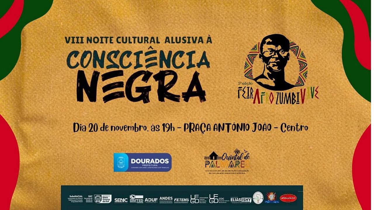 A Prefeitura de Dourados, por meio da Coordenação de Direitos Humanos e Cidadania e Secretaria Municipal de Cultural, em parceria com o Centro Cultural de Divulgação e Valorização das Culturas Africanas e Afro-brasileira Quintal de Palmares (Comafro), Secretaria de Estado de Cidadania e a Subsecretaria de Políticas Públicas para Promoção da Igualdade Racial de MS, realiza nesta quinta-feira (20), na Praça Antônio João, a partir das 17 horas, uma ampla celebração cultural em alusão ao Dia Nacional da Consciência Negra.